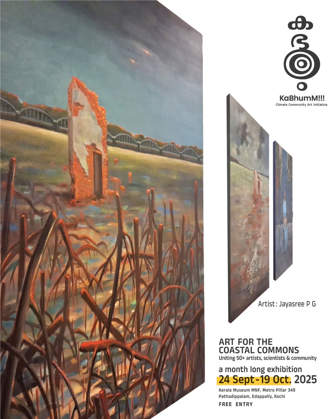Jayasree P.G. has now exhibited her paintings in more than 40 shows including the Lalita Kala Academy's state shows and Lokame Tharavadu' (The World is One Family) a mega art show of more than 200 Indian Artists in Alappuzha in 2022 and "BURNED ADOBE" SOLO ART SHOW held at CHOLA ART GALLERY, Chalakudy. She is regularly invited to many professional artist's camps including 'Kranthi' a week-long artist's camp with prominent Bangladeshi Artists as part of an 'Art Exchange Project' by the state in 2023.